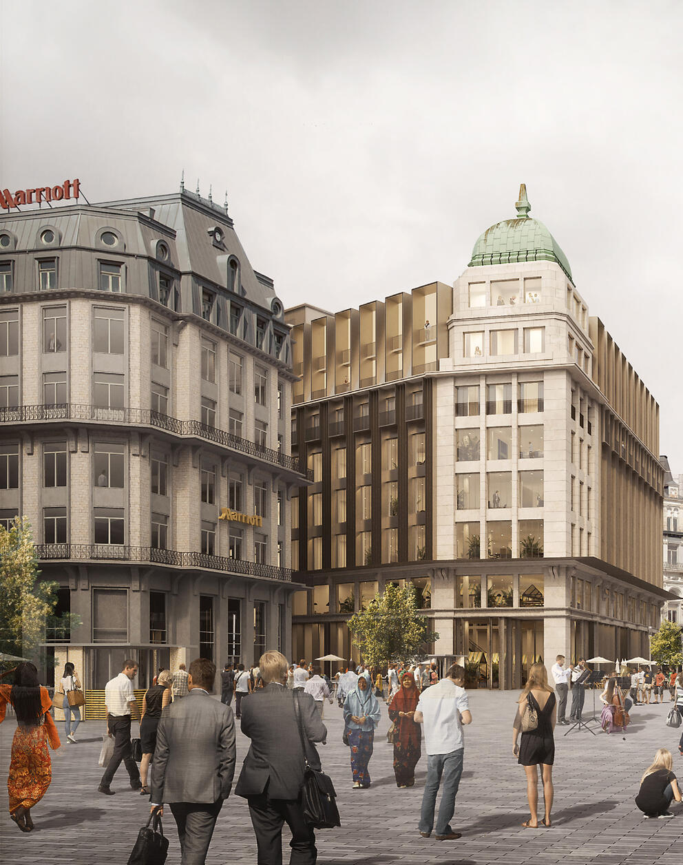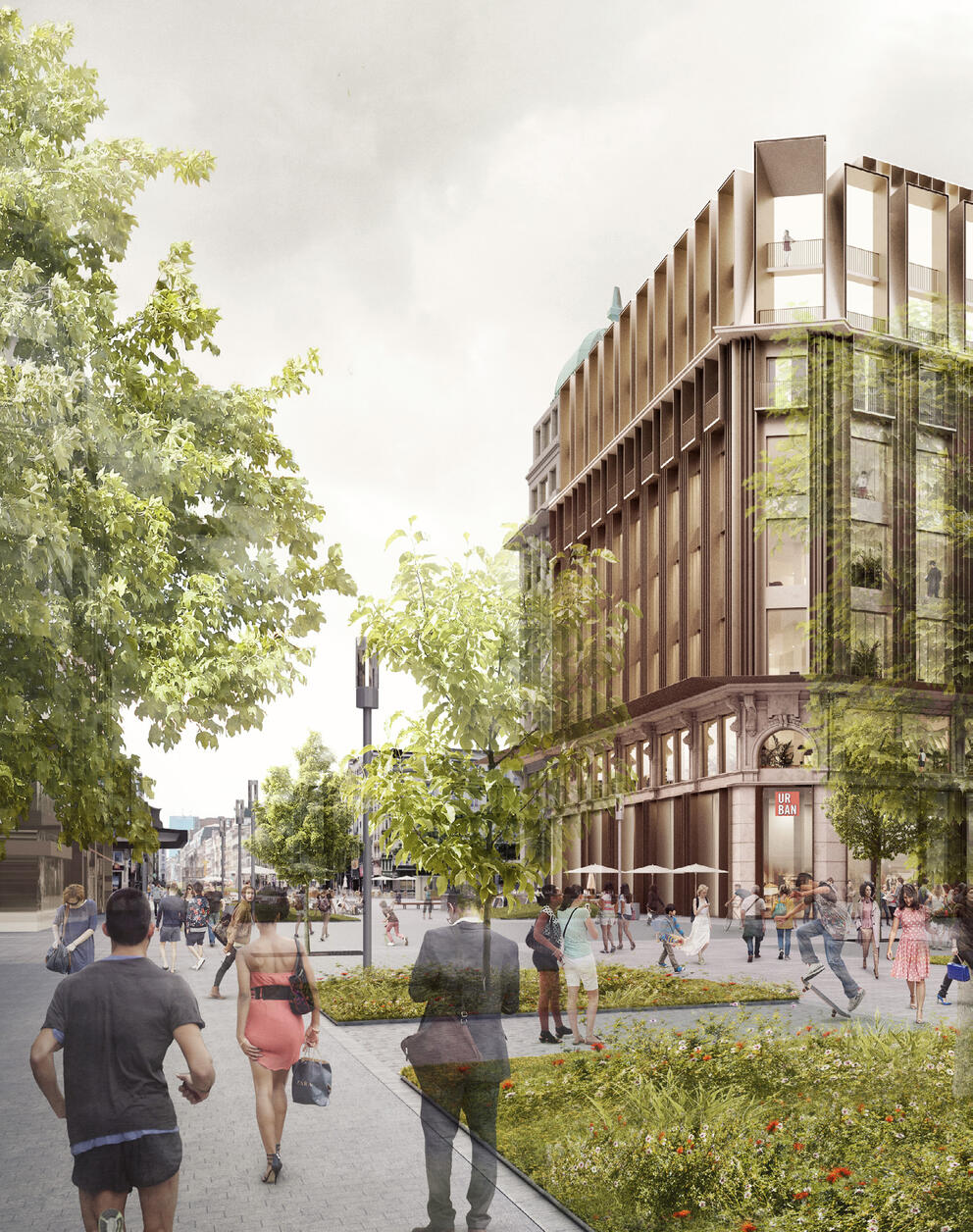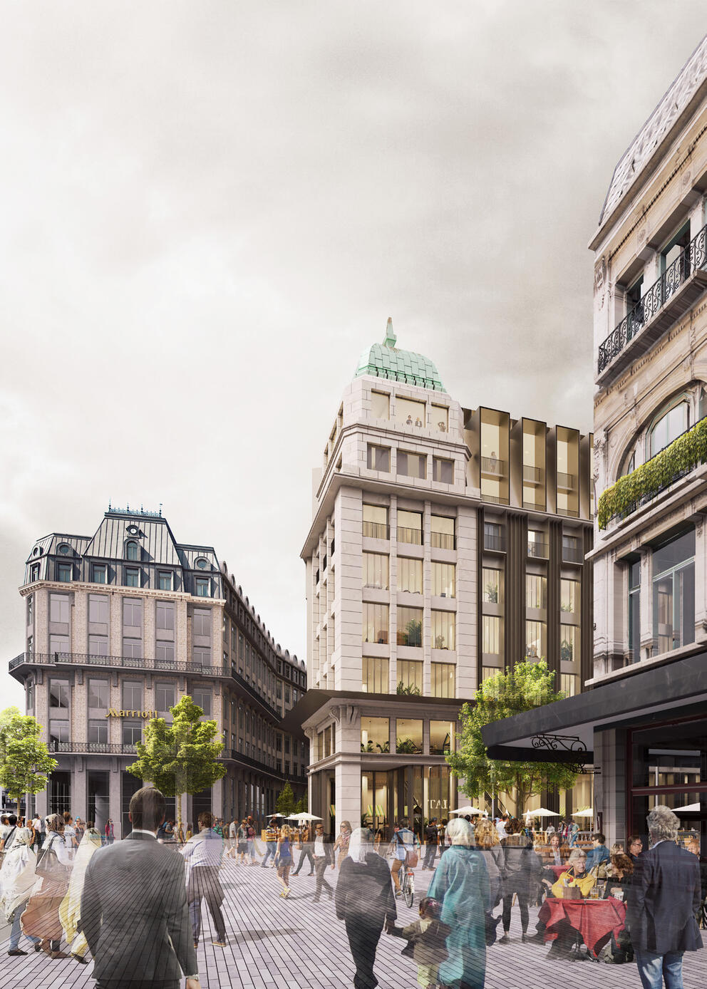 The developers have joined forces with renowned architects Coussée & Goris. In its proposal, the team reinterprets the Haussmannian architecture which is so typical of the city's central boulevards, restoring a strong architectural identity to the building. The vertical elements will be accentuated, the mansard roof replaced by slender dormer windows, balconies created under the cornices, and the awning strongly emphasised. Historical elements like the dome will also be restored to their full glory. Rue Marché aux Poulets, the part of the block with less architectural value, will be replaced by a new building.