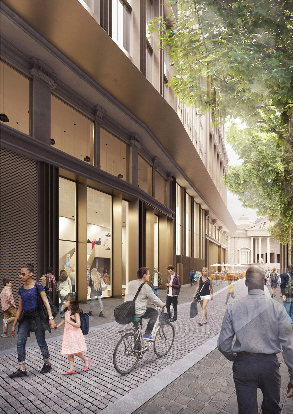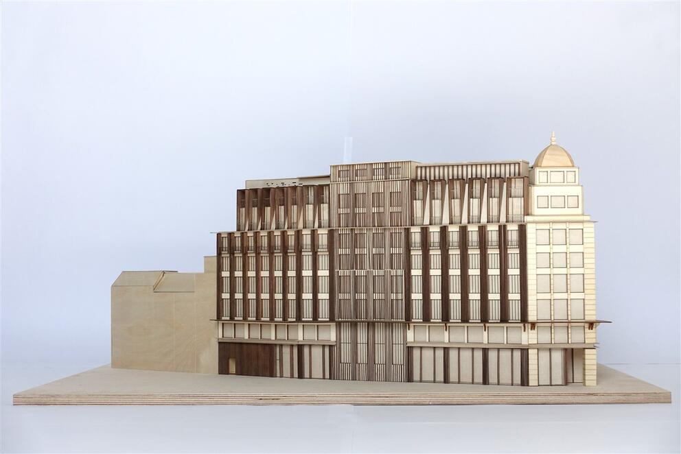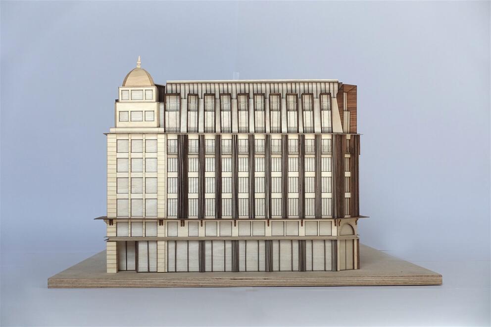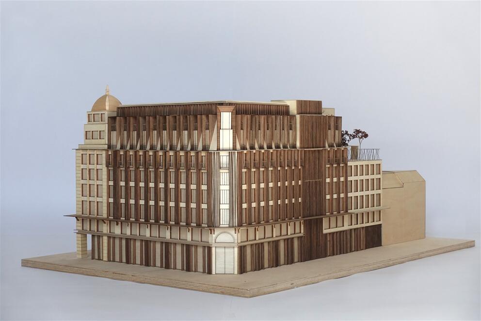 The developers have joined forces with renowned architects Coussée & Goris. In its proposal, the team reinterprets the Haussmannian architecture which is so typical of the city's central boulevards, restoring a strong architectural identity to the building. The vertical elements will be accentuated, the mansard roof replaced by slender dormer windows, balconies created under the cornices, and the awning strongly emphasised. Historical elements like the dome will also be restored to their full glory. Rue Marché aux Poulets, the part of the block with less architectural value, will be replaced by a new building.