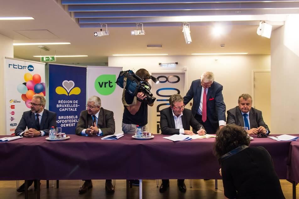 This afternoon, the Brussels Minister-President Rudi Vervoort, the Regional Finance and Budget Minister Guy Vanhengel and the managing directors of RTBF and VRT, Jean-Paul Philippot and Paul Lembrechts, signed the notarial deed by which the Brussels-Capital Region acquires the sites of the two public television broadcasters on Boulevard Reyers. The sale agreement was signed on 23 May this year.