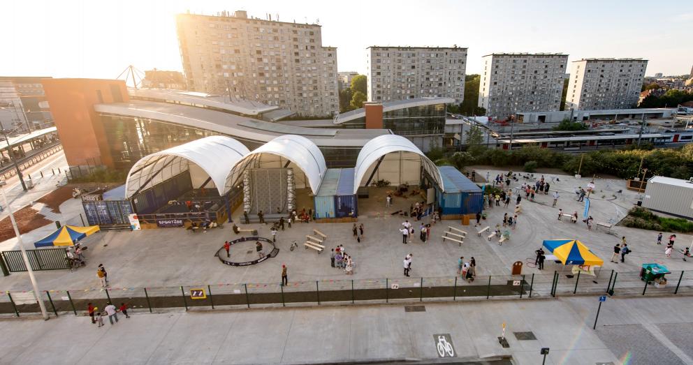 - the SAU, on the basis of one of the roles assigned to it by the Region, organised an architectural competition (won by 1010 Architecture & Urbanism) and has financed the fitting-out of the site: the installation of six containers connected by a series of lightweight, semi-transparent roofs to accommodate the various activities, and of an additional unit for the site manager appointed by the municipality; the landscaping of the surrounds, the plantations and the public spaces; the adaptation of the fence; water, gas and electricity supplies; and lighting. The SAU obtained planning permission in late January 2020 and oversaw conversion work on the site that took place between March and September 2020.
