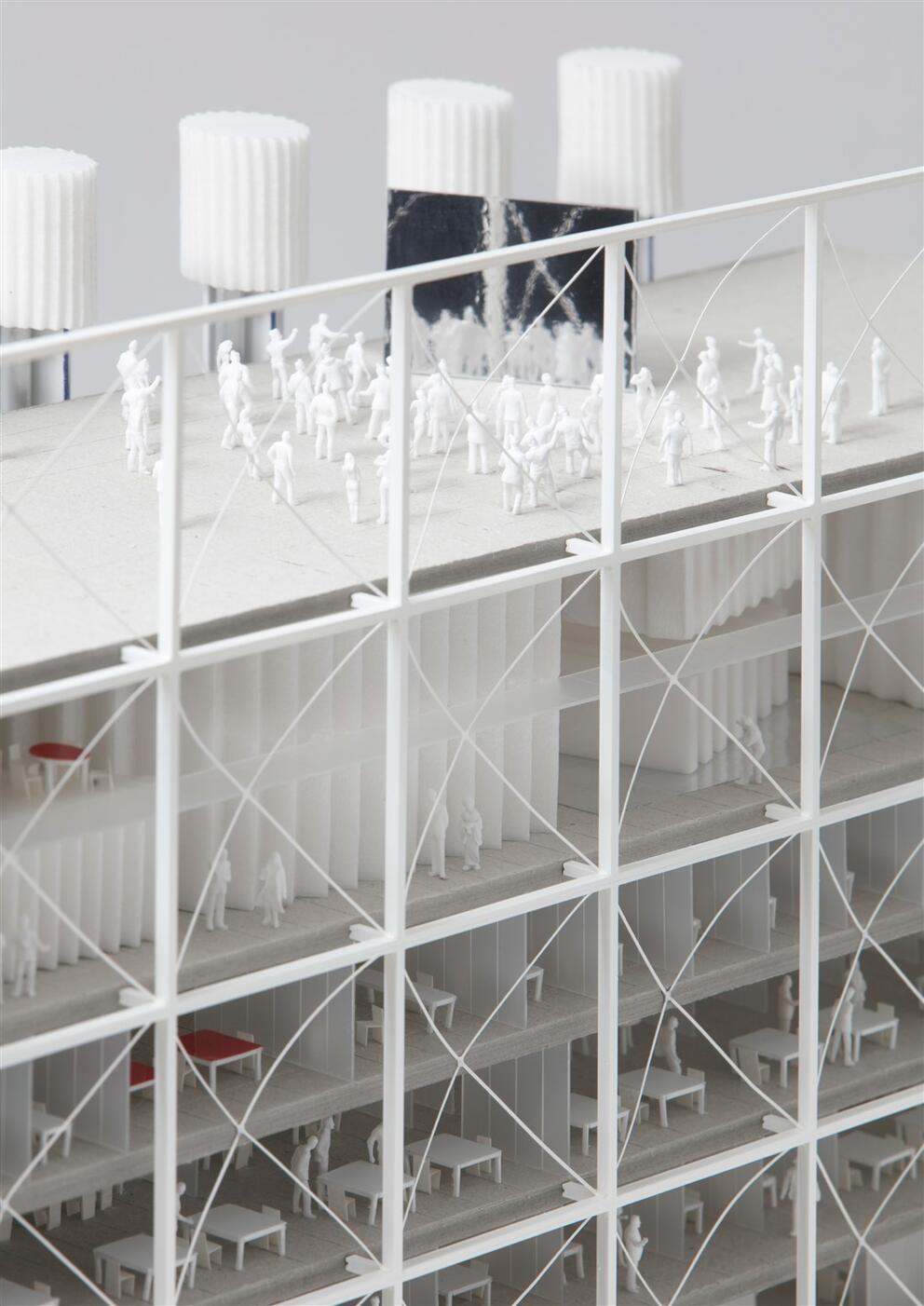 The name chosen for the building by the SAU and the main future occupants, Frame - Brussels media community, refers to the ‘framework’ provided by the building for the development of a media-oriented ecosystem. It also alludes to the shape and structure of its main façade looking towards Diamant; to the ‘window’ onto mediapark.brussels that it will be; to the camera frame in visual media; and to the frame in web design.
