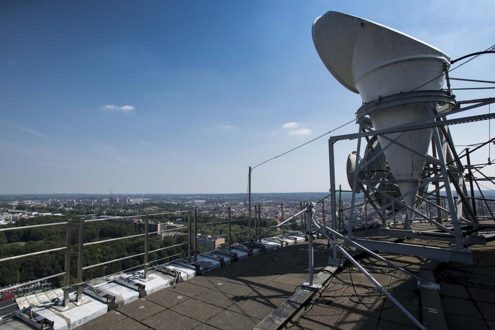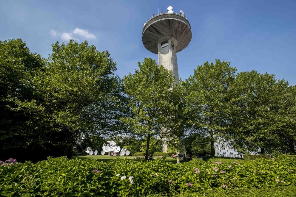 The RTBF and VRT transmission tower’s construction in 1979 was a feat of architectural engineering, and the structure has been an iconic landmark in the Brussels cityscape for over 40 years. With its circular saucer 34 metres across and 16 metres deep placed on a central pillar 73 metres high, it has a total height of 89 metres.