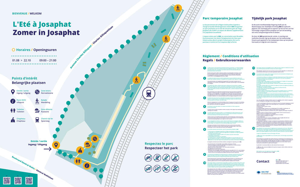 Gilles Delforge, the director of the SAU, stated that ‘In this very short three-week period, working with various actors, we have already succeeded in putting a number of arrangements in place. Some of these are already being worked on, and others will evolve further. From this Saturday 1 August, especially given the weather forecast, the people of Schaerbeek, Evere and Brussels in general can enjoy a great day exploring the site with family or friends. All the ingredients will be there: a path for walking, a refreshment bar, a terrace, a relaxation area with deckchairs, pétanque and cage football, a marquee, an information point, toilets... “Les Nouveaux Disparus”, a non-profit organisation which has been one of our temporary occupants on this site for several years, will run construction workshops for visitors using pallets, during which furniture such as benches will gradually be produced for this temporary park. It will also ensure that the site is run smoothly, including reception, information, a refreshment bar, compliance with the rules, dealing with litter and so on. We are also planning a cultural activity every weekend, in compliance with the Covid-19 public health rules. The SAU has also launched a call for food trucks to be present during the weekends. I am very grateful to all those who have made it possible for the SAU to meet this operational challenge in three weeks. During this period, we have also informed the non-profit sector through the municipalities of Evere and Schaerbeek and the local residents through the neighbourhood committees. As announced, we have also had fences put up to ensure that visitors are kept at a safe distance from the railway tracks and, in consultation with Brussels Environment, to delimit a large area of the site which will remain inaccessible.’ The temporary park is located on the site of the future linear park featured in the project for the development of the former Josaphat marshalling yard, and has the same basic outline.