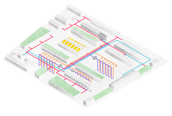 To supply all buildings on the site and allow for future expansion beyond the district, the SAU, in collaboration with ULB, has built a district heating network powered by 132 geothermal probes and a CO₂ heat pump. This network meets the heating and cooling needs of the entire site, contributing to the Region’s decarbonisation efforts.